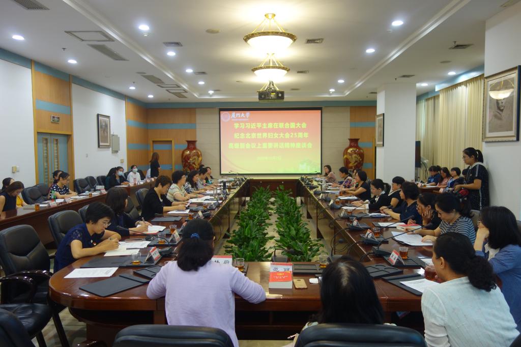 10月7日下午,厦门大学召开学习习近平主席在联合国大会纪念北京世界妇女大会25周年高级别会议上重要讲话精神座谈会。厦门大学副校长,全国妇联、中国妇女研究会与厦门大学共建妇女/性别研究与培训基地主任邓朝晖出席。