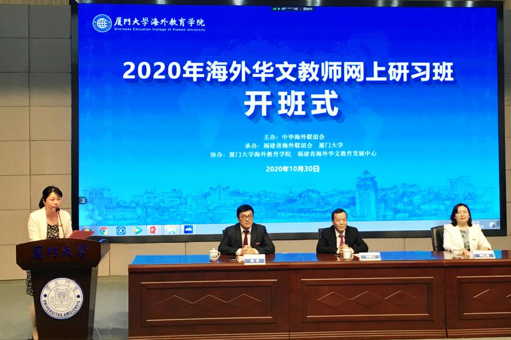 10月30日下午,由中华海外联谊会主办,福建省海外联谊会、厦门大学承办,厦门大学海外教育学院、福建省海外华文教育发展中心协办的2020年海外华文教师网上研习班在厦门大学翔安校区德旺图书馆小报告厅开班。福建省海外联谊会副会长郑惠文,厦门大学海外教育学院/国际学院院长陶涛,厦门大学党委统战部副部长秦红梅,福建省海外联谊会文化教育处处长游理忠,福建省海外华文教育发展中心主持工作副主任吴宗斌出席开班式。14个国家的584名学员在线参与此次培训。海外教育学院华文系(主持工作)副系主任潘超青主持开班式。