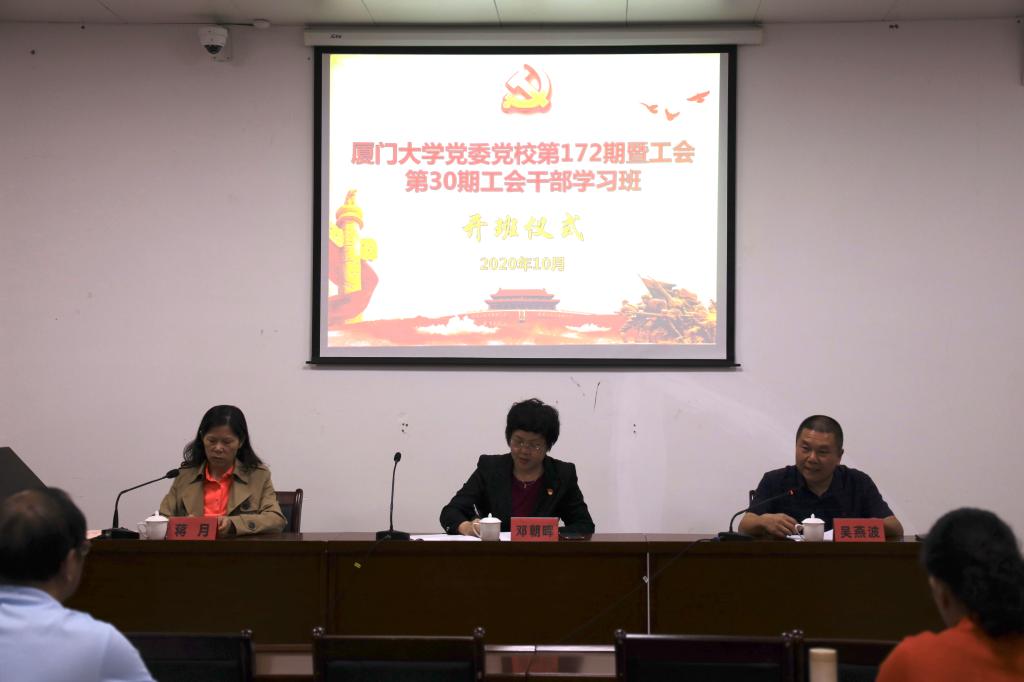 10月30日,厦门大学党委党校第172期暨工会第30期干部学习班在宁德市委党校开班。校党委常委、副校长邓朝晖,校工会副主席蒋月、余炳建以及校工会“两委”委员、各部(委)部长(主任)、各部门工会主席、各协会会长的部分成员共16人参加本次学习。
