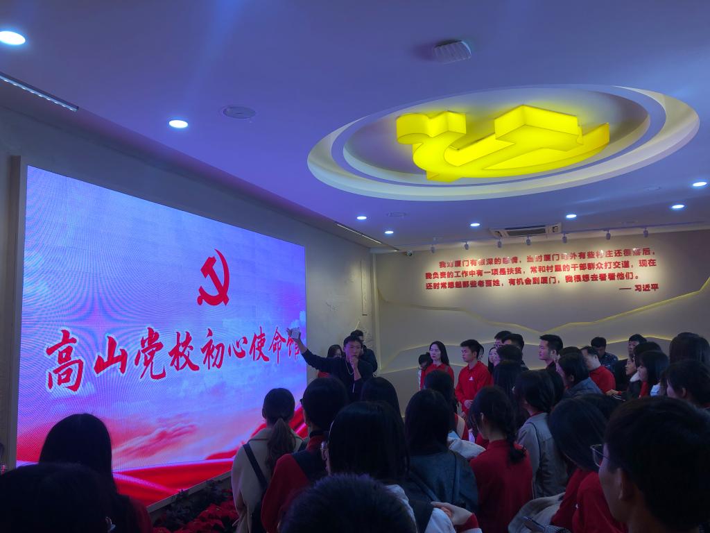 贫困之冰,非一日之寒;破冰之功,非一春之暖。脱贫攻坚任务能否完成,关键在人,关键在思路。6日上午,全体师生先后参观了同安莲花镇军营村、防空哨所、高泉国旧居等地,感受习近平总书记当年两上高山访贫问苦、指导脱贫的高山情缘,重温习近平总书记的足迹。在高山党校初心使命馆,师生回顾了习近平总书记当年在厦门经济特区与广大干部群众并肩奋斗的探索与实践。一张张图片、一件件实物、一幕幕视频,展示的不仅是历史,更生动讲述着习近平总书记“振奋精神,扶贫扶志”的使命担当。在展馆门前,杨建中带领全体党员同志重温入党誓词,牢记党的初心使命,感恩奋进。