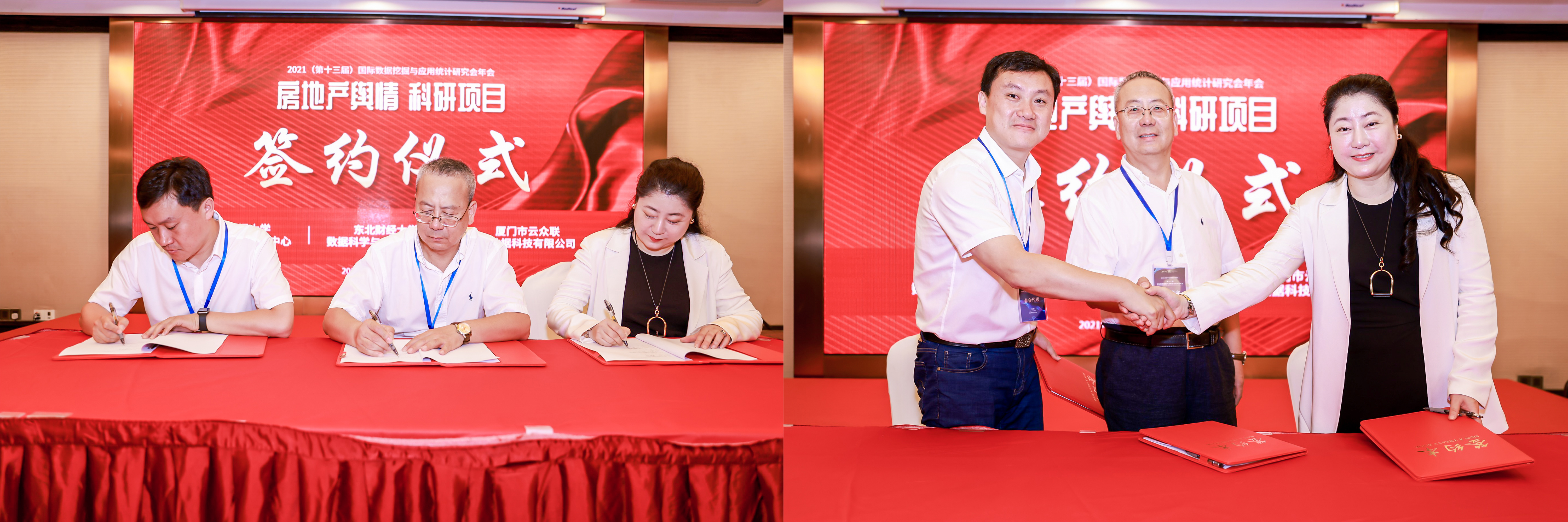 本次年会设置六个平行分会场,有来自高校和企业的58位代表分享了他们近期的研究成果。分会场一为大数据与数据科学专场,报告主要涉及文本大数据、图像文本识别、深度学习算法应用和指数构建等。分会场二为统计理论与方法专场,报告主要涉及多视角学习,函数数据分析,分位数回归,奇异值分解,贝叶斯理论,现状数据降维等。分会场三为经济统计发展前沿专场一,报告主要涉及数字经济影响,城市经济效率测度,产业集群发展,收入分配的消费影响等。分会场四为经济统计发展前沿专场二,报告主要涉及区域经济发展、疫情后经济恢复、互联网大数据经济等。分会场五为数字金融与金融科技专场,来自商业银行、金融科技企业和高校的代表分享了在大数据普惠金融时代,知识图谱和自然语言处理等人工智能关键技术在个人信用风险和系统性金融风险的实践及案例分享等。分会场六为在数字地产与数据新动能专场,厦门大学数据挖掘研究中心朱建平教授、东北财经大学数据科学与人工智能学院徐建教授和厦门市云众联大数据科技有限公司董事长李秀荣为代表进行了房地产舆情科研项目合作签约仪式,共同研讨“房地产舆情”为房地产金融市场带来的数字化转型和机遇。该专场报告主要涉及信用大数据、数字化转型、生态福利绩效、绿色发展、创新策源能力和住房需求等。