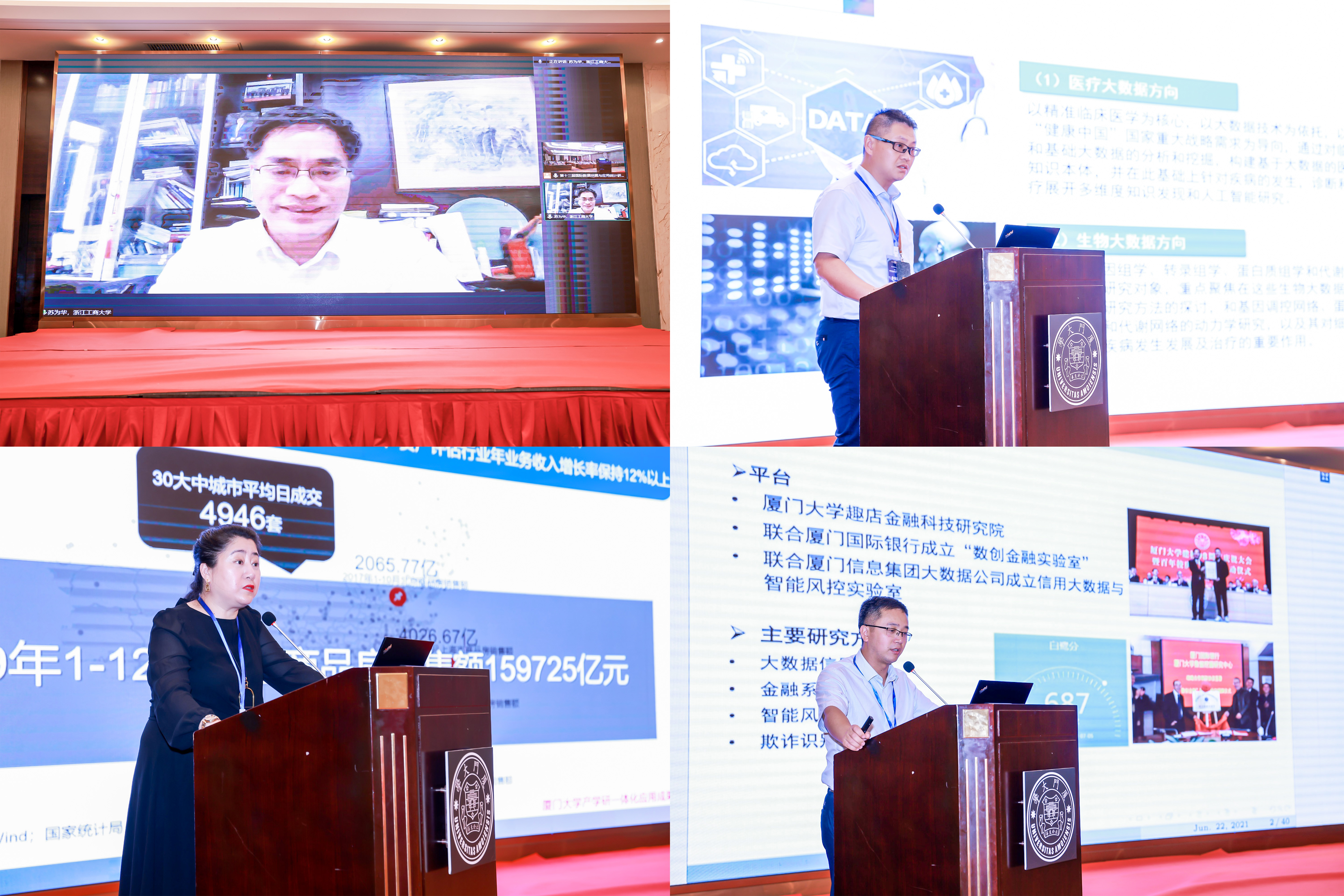 开幕式后,南开大学统计与数据科学学院执行院长、长江学者、国务院学位委员会统计学科评议组成员王兆军教授,作题为《新时代下的统计人才培养》报告;厦门国际银行首席信息官王鹏举先生,作题为《厦门国际银行金融科技数字化转型和智能化应用》的报告;浙江财经大学书记、教育部高等学校经济学类专业教学指导委员会副主任委员李金昌教授,作题为《共同富裕的统计解读》的报告;上海对外经贸大学校长、国务院学位委员会统计学科评议组成员、教育部高等学校统计学类专业教学指导委员会副主任委员汪荣明教授,作题为《大数据背景下健康保险的统计精算建模研究》的报告;浙江工商大学副校长、教育部高等学校统计学类专业教学指导委员会委员苏为华教授,在线远程作题为《基于线上线下相结合的工业企业电子商务销售规模‘脱敏’调查估算——浙江省金华市的试点经验介绍》的报告;厦门大学健康医疗大数据国家研究院副院长李奇渊教授,作题为《大数据赋予医疗技术和健康管理的全新模式》的报告;厦门云评众联科技有限公司总裁、董事长李秀荣女士,汇报了《数字地产与数据新动能》;厦门大学数据挖掘研究中心副主任、经济学院方匡南教授,作了题目为《Community influence analysis in social network》的报告。