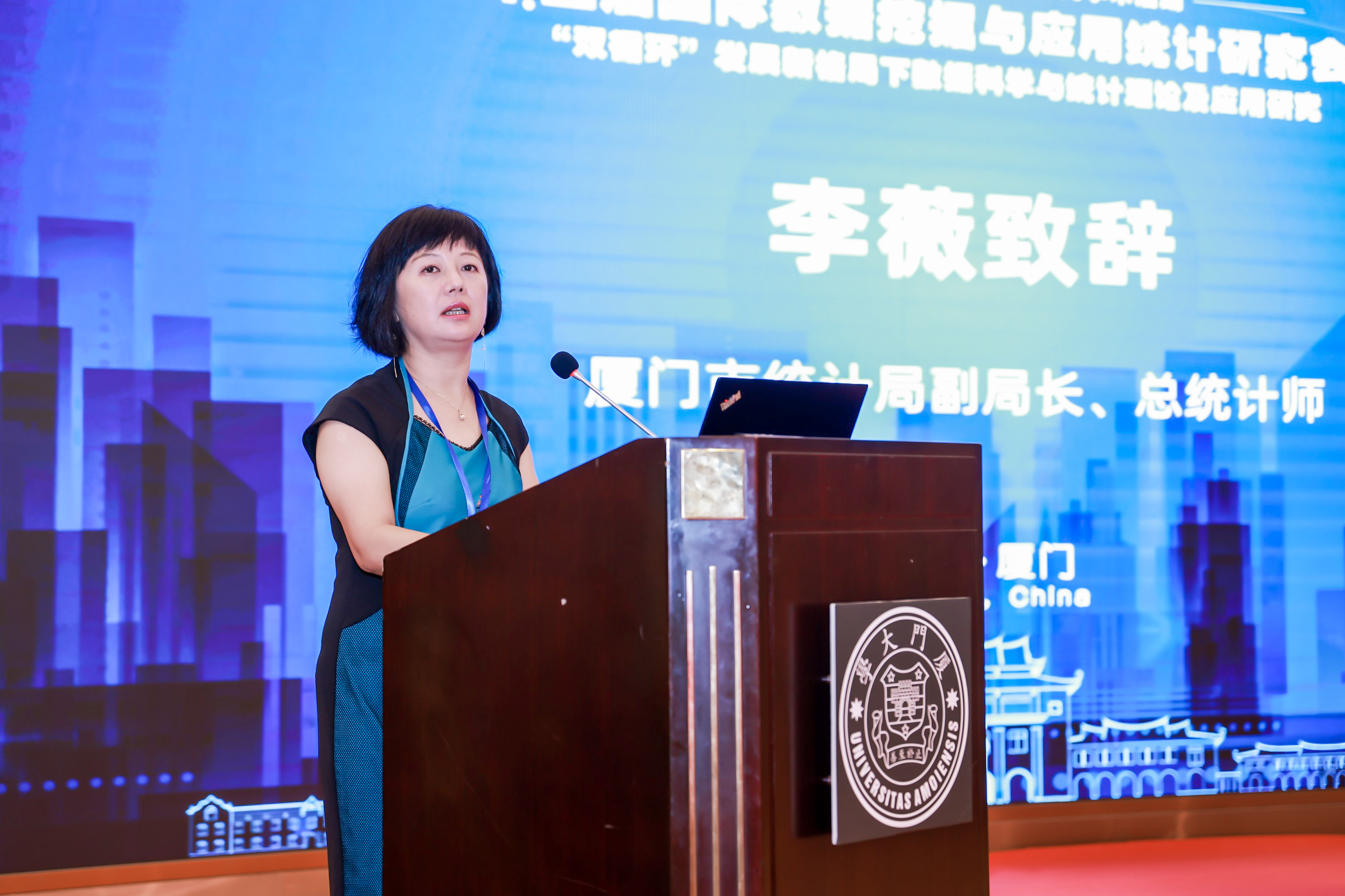 厦门市统计局副局长、总统计师李薇女士代表厦门市统计局、厦门市统计学会作致辞发言。在开幕式上,李薇女士向参会代表介绍了厦门“高素质”、“高颜值”、“现代化”和“国际化”的发展现状,以及厦门市统计局面临复杂疫情影响和形势做出的努力。李薇女士表示厦门市正迎来新的发展机遇,欢迎参会嘉宾携手合作,共创未来。