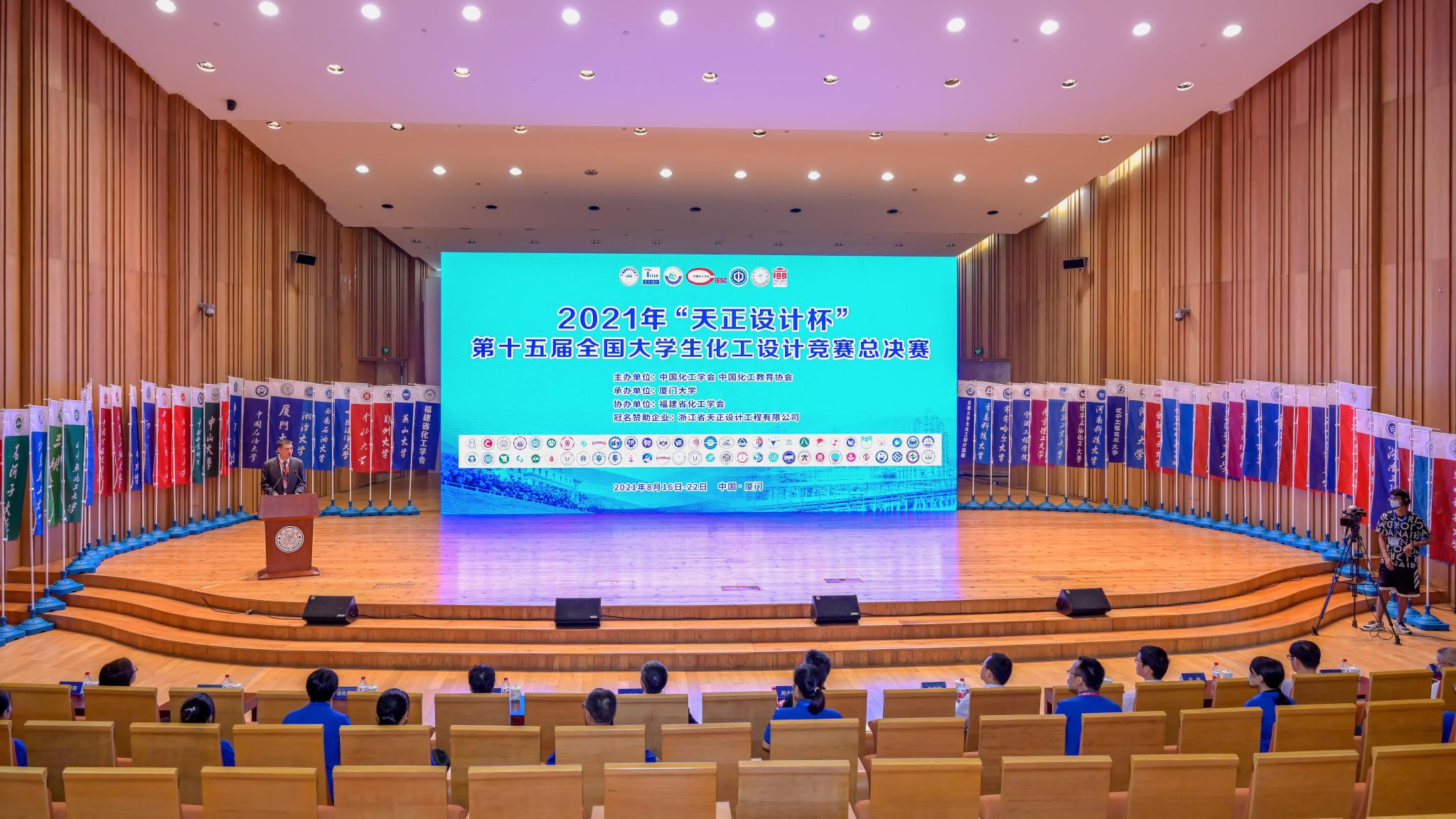 8月21日上午举行总决赛开幕式,仪式由厦门大学化学化工学院院长谢兆雄主持。厦门大学副校长周大旺、福建省化工学会理事长、集美大学校长李清彪、浙江省天正设计工程有限公司总工程师吴晓军出席开幕式。中国化工学会副理事长兼秘书长华炜、教育部高等学校化工类专业教学指导委员会副主任委员、浙江大学教授李伯耿、全国大学生化工设计竞赛秘书长、浙江大学教授王靖岱在线上参加仪式。
