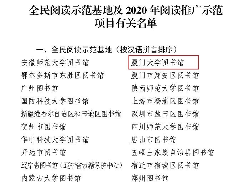 近日,中国图书馆学会公布20家“2020年全民阅读示范基地”名单,厦门大学图书馆入选。