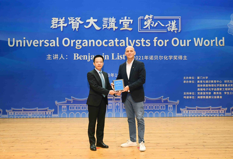 10月17日晚,厦门大学“群贤大讲堂”第八讲在思明校区科学艺术中心音乐厅举办。2021年诺贝尔化学奖得主、德国马克斯-普朗克煤炭研究所所长本亚明·利斯特(Benjamin List)教授为师生带来了一场题为“Universal Organocatalysts for Our World”的精彩报告。副校长史大林教授出席活动并为利斯特教授颁发“群贤大讲堂讲座”纪念牌。中国科学院院士田中群教授主持活动。活动现场座无虚席,师生、校友代表等近600人相聚音乐厅,不愿错过这场与诺贝尔奖得主“面对面零距离”的学术盛宴。
