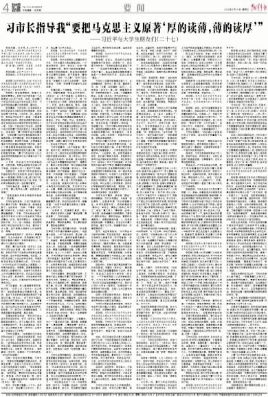 3月16日,《中国青年报》整版刊发《习市长指导我“要把马克思主义原著‘厚的读薄,薄的读厚’”》一文,这是《习近平与大学生朋友们》系列专题报道的第二十七篇。文中,我校1983级经济系校友张宏樑回忆了大学期间,习近平同志同他讨论《资本论》课程的学习,分享自己当年在梁家河研读《资本论》等经典著作的体会,讲述了习近平同志对一个普通厦大学子的亲切关怀。