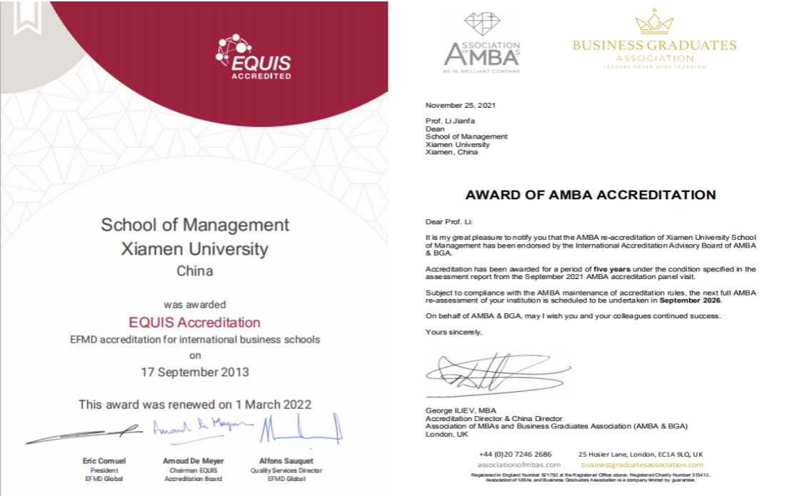 近日,接EQUIS认证委员会正式通知,厦门大学管理学院正式通过欧洲质量发展体系(European Quality Improvement System, EQUIS)的再度认证,授予EQUIS最高标准的五年期认证。此前,管理学院已于2021年11月26日被英国工商管理硕士协会AMBA(The Association of MBAs)授予五年期再认证。至此,厦门大学管理学院完成再认证评估,获得EQUIS、AMBA国际双认证最高标准。
