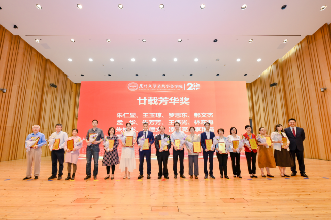 韶光流转,盛世如约,含英毓秀,桃李二十载。二十年来,公共事务学院的诸位老师辛勤耕耘、竭诚付出,为感念师恩、表彰先进,大会现场为陈振明颁发了卓越贡献奖,为吴仲平、黄强等教师颁发了银发奉献奖,为朱仁显、罗思东等教师颁发了廿载芳华奖。于文轩、学院青年教师代表共同为各位老师颁发奖牌,学生代表为老师们献上感恩的鲜花,送上最诚挚的祝福。