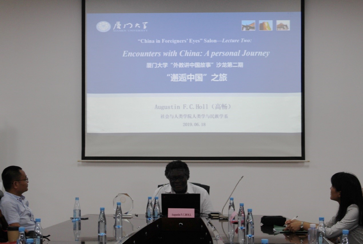 6月18日下午,由学校国际处主办、社会与人类学院承办的厦门大学“外教讲中国故事”沙龙第二场在南光一320会议室举办 社会与人类学院法国籍教授Augustin F.C. Holl(高畅)以“邂逅中国”之旅为题作了讲座,国际处副处长余宏波主持。学校外籍教师、外籍博士后、外事秘书和学生代表参加了活动。