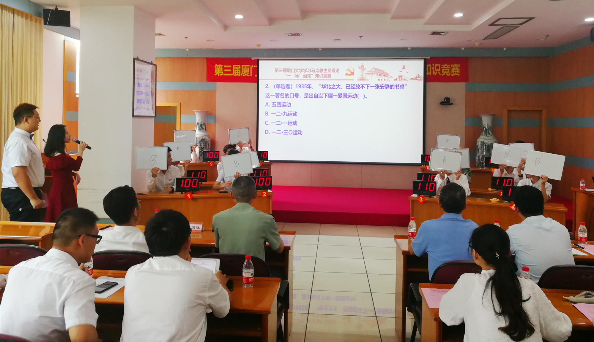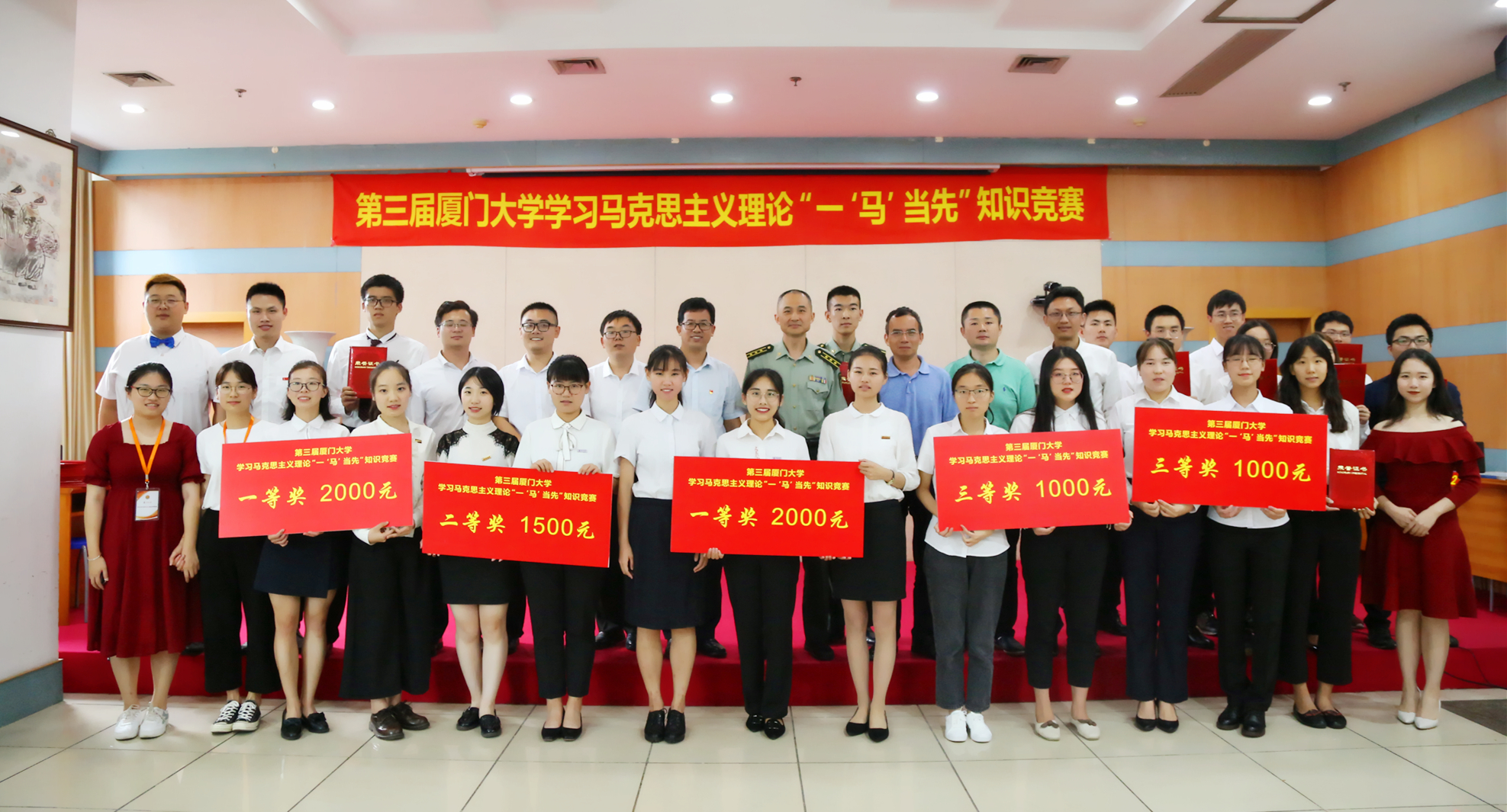 6月2日,由校党委组织部、党委宣传部、党委学生工作部、共青团厦门大学委员会、马克思主义学院共同主办,厦门大学学生马克思主义理论研修班承办的第三届厦门大学学习马克思主义理论“一‘马’当先”知识竞赛决赛在颂恩楼220报告厅顺利举行。马克思主义学院党委书记侯利标、中国人民解放军驻厦门大学选培办主任王飞、党委组织部副部长乔连全、党委宣传部副部长曾铮、党委学生工作部副部长袁国柱出席了决赛并为获奖者颁奖。