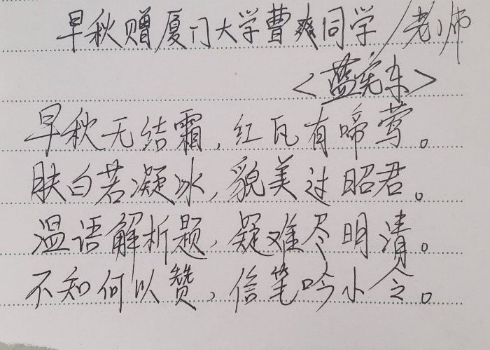 “早秋无结霜,红瓦有啼莺。肤白若凝冰,貌美过昭君。温语解析题,疑难尽明清。不知何以赞,信笔吟小令。”一首五言律诗,不出自名家之手,也未曾经历百年风霜,却饱含着龙海一中蓝宪东同学对红树林微光实践队队员曹爽同学的感激之情。