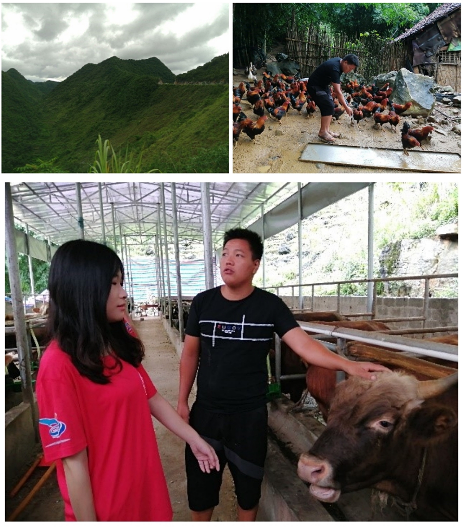 一条弯弯曲曲的水泥路从山坡向被大山环绕的洼地延伸,而这个洼地就是合作社的养殖基地和种植基地。平地搞种植,高地搞散养,村民们充分利用山地地形特征,进行鸡、牛、羊的养殖,并进行核桃种植,为了进一步提高核桃的质量和产量,农户们还在尝试通过嫁接等技术来对植株进行改良。“特别有意思的是,为了防止鸡群在打雷时候因慌乱发生踩踏事故,农户们还会给鸡放音乐,让七百弄鸡熟悉高音贝的生活环境”, 实践队员陆晓玲惊喜地发现,“在因地制宜的基础上结合科学的种植、养殖方法,不被地形所限制,跳出传统思维,可将九分的劣势扭转成十分的优势!”