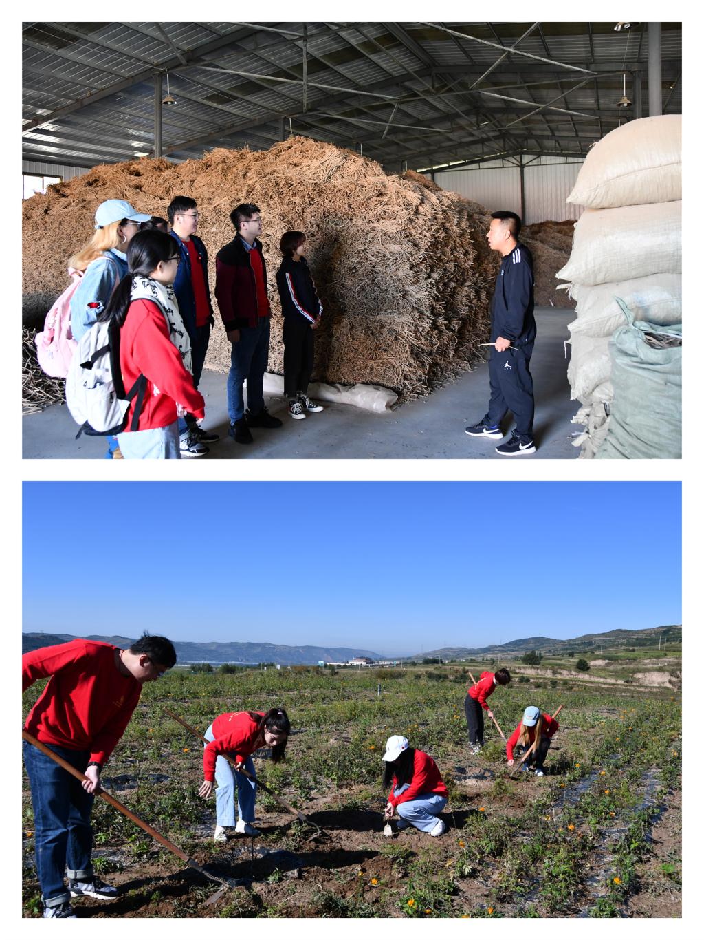 随后,实践队在中药种植大户赵潇潇的带领下开展田间劳动。在金莲花穴盆苗种植基地,队员们扛起手中的锄头开始锄草。太阳渐渐升起,温度越来越高,队员们额头上的汗珠在一颗颗地往外冒。“从一开始连杂草都辨认不清,到可以独立处理一片田地,这让我体会到面朝黄土背朝天的艰辛,同时也收获了劳动的快乐。”实践队员郭妙婷感慨道。