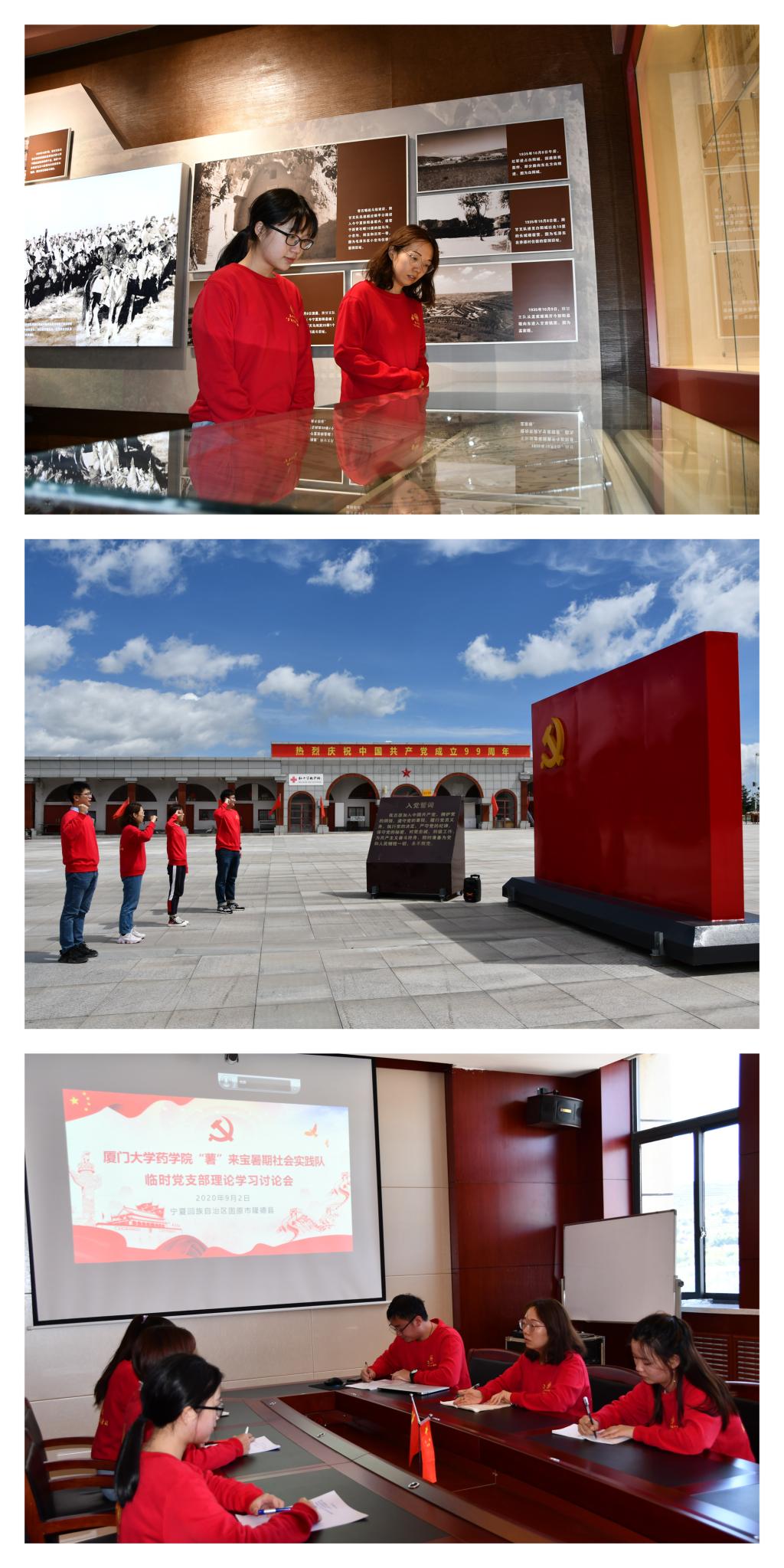9月3日,是中国人民抗日战争暨世界反法西斯战争胜利75周年,实践队一行来到六盘山将台堡红军会师纪念馆学习参观。活动包括重走长征路、重述长征故事、重温入党誓词。迎着朝阳,实践队从山底出发,沿着蜿蜒小道徒步上山,感受长征胜利时“红旗漫卷西风”的壮志豪情;沿着150多级台阶拾级而上,进入馆内,先后参观“红军不怕远征难”、“三军过后尽开颜”等四个展厅,详细观看红军长征中的文物、图片等资料,重述中国工农红军三次经过六盘山时的斗争历史;最后,实践队临时党支部成员在巍峨的六盘山红军长征纪念碑下,庄严宣誓。