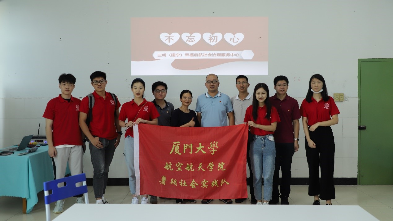 为贯彻落实“不忘初心·牢记使命”主题教育以及习近平总书记在决战决胜脱贫攻坚座谈会上的重要讲话精神,积极响应厦门大学航空航天学院党委“攻坚领航”行动号召,2020年8月31日至9月2日,“朝夕远程教育”社会实践队一行前往福建省三明市建宁县开展“关爱空巢老人”、“筑梦少年成长”、“传承红色基因”、“厉行节约品质”、“强化劳动精神”等专题实践。实践队由航空航天学院党委副书记张晴、团委副书记倪建超、辅导员刘群带队,来自航空航天学院、艺术学院、管理学院、公共事务学院、建筑与土木工程学院、信息学院的8名本科生和硕士生参加。
