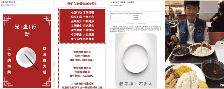 为规范师生的具体言行,学院官微推送“光盘行动”系列报道,通过实地拍摄的照片、形象化的图片、幽默精彩的宣传语、细致认真的科普文字等,吸引师生阅读学习,让“厉行节约”不成为一句简单口号,而是通过个人努力和相互督促养成的生活习惯,“浪费可耻、节约为荣”的理念深入航院师生心中。