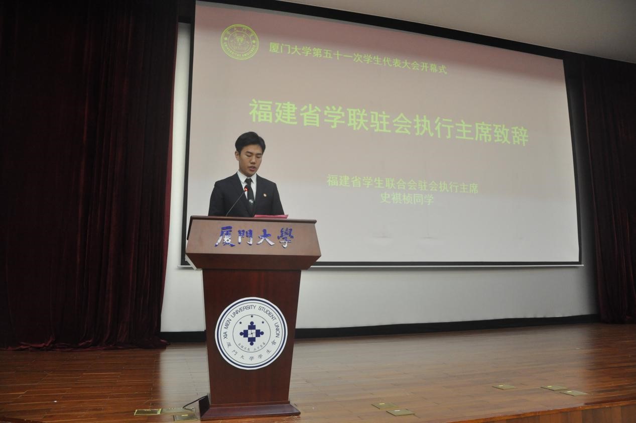 10月24日,学校第五十一次学生代表大会在翔安校区德旺图书馆召开。校党委副书记赖虹凯,福建省学生联合会执行主席史祺桢,组织部、宣传部、统战部、学生工作部(处)、保卫部(处)、翔安校区党工委、研究生院、校团委负责人及各学院党委、团委负责人出席大会开幕式,清华大学、中国人民大学等兄弟高校学生会也对大会的召开发来贺信。