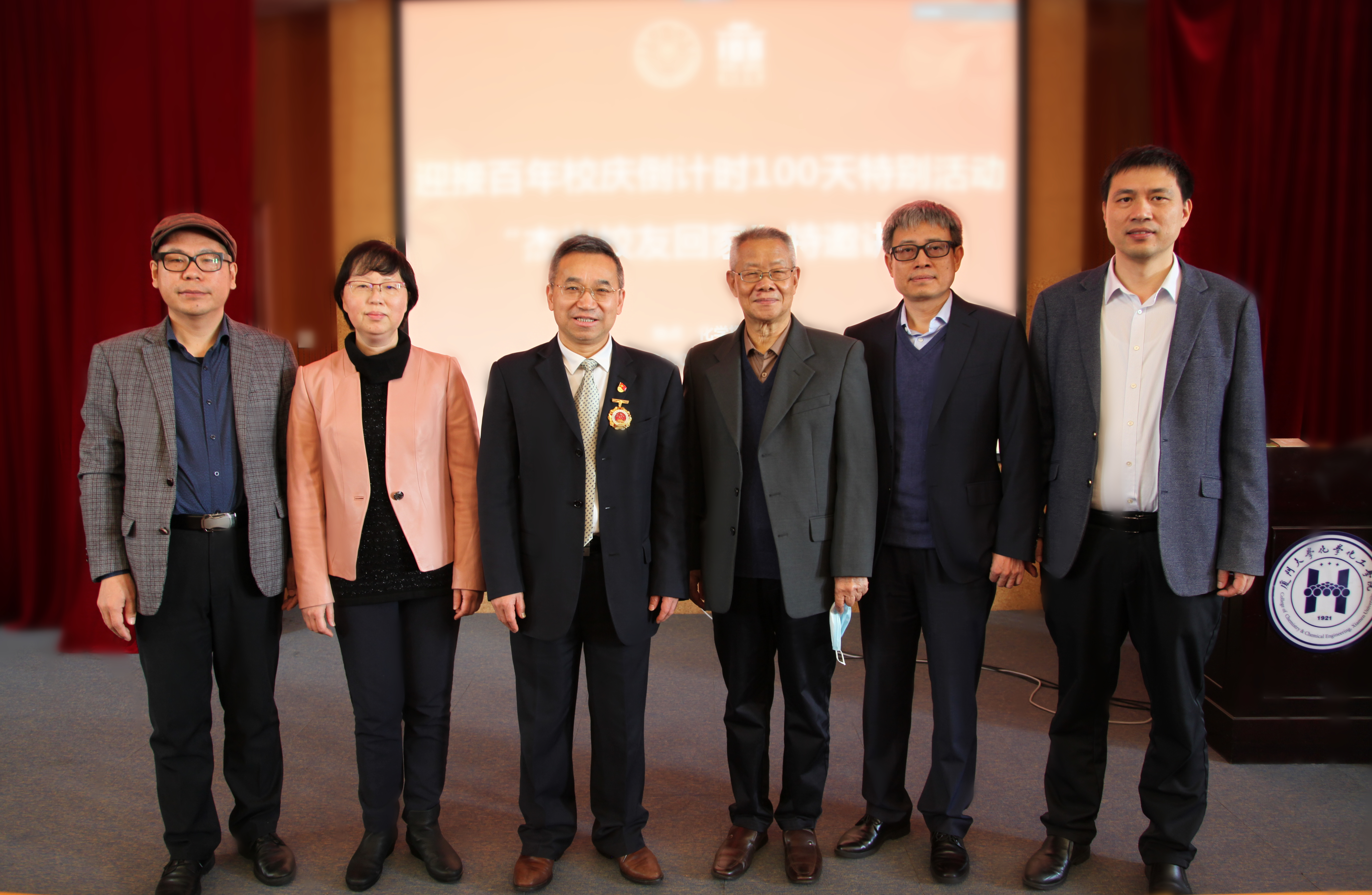 12月27日,百年校庆倒计时100天之际,化学化工学院特别邀请两位2020年全国劳动模范校友重返母校。1988级化学系校友、上海洗霸科技股份有限公司董事长王炜,1987级科仪系、1994级化学系校友、广州禾信仪器股份有限公司董事长、暨南大学质谱仪器与大气环境研究所所长周振,做客奋斗化院人——“校友回家”特邀讲座。讲座在思明校区化学报告厅举行。化学化工院长谢兆雄教授、党委副书记刘俊杰、分析科学研究所李耀群教授、关工委常务副主任潘宝柱出席讲座。活动由刘俊杰主持。