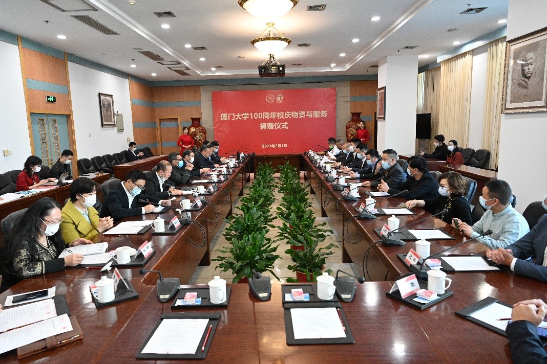 会上举行简朴而隆重的捐赠仪式。厦门文广会展有限公司为厦门大学100周年校庆捐赠整体主视觉VI设计、延展设计及办公室氛围布置,厦门铜鱼堂文化创意有限公司捐赠一批珠光青瓷办公杯,李宝凤捐赠个人作品陈嘉庚剪纸肖像,卢荣斌捐赠一批纪念钢笔,福建五叶堂茶叶有限公司捐赠一批福鼎白茶,福建影照建盏陶瓷有限公司捐赠一批建盏,厦门凌云玉石集团捐赠玉石浮雕,厦门服云信息科技有限公司捐赠网络安全运营中心系统,北京壹体体育产业发展有限公司捐赠会务系统。李建发向各捐赠代表颁授捐赠证书。捐赠仪式后,各位来宾、校友代表先后发言,分享捐赠心情,表达校庆祝福。