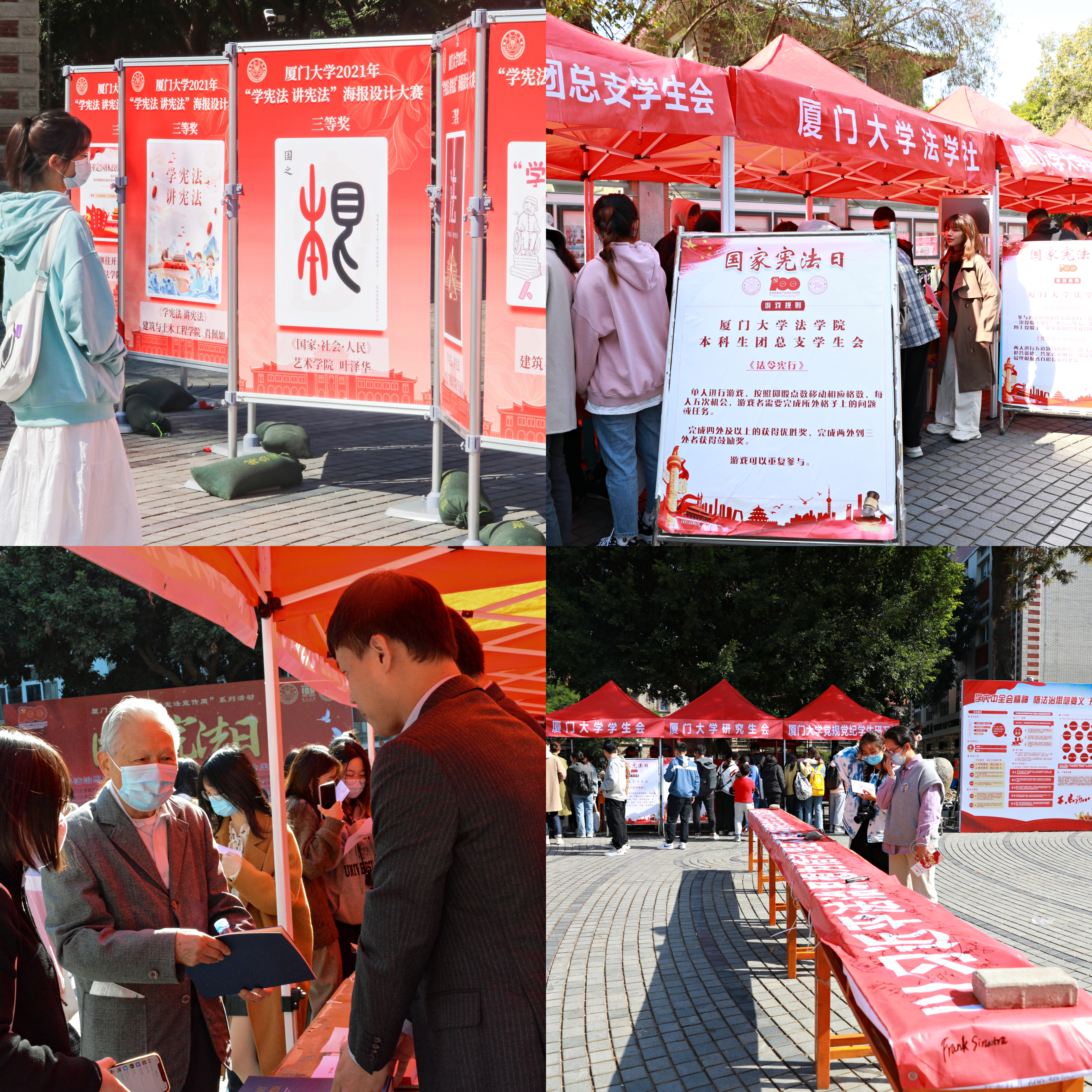 在第八个国家宪法日来临之际,12月4日上午,厦门大学2021年“国家宪法日”主题宣传教育活动举行。活动以“以习近平法治思想为指引,坚定不移走中国特色社会主义法治道路”为主题,现场结合重温宪法、读本发放、法律咨询、比赛表彰、成果展示、游园活动等多种方式弘扬宪法精神,引导师生认识宪法,提升师生法治素养。
