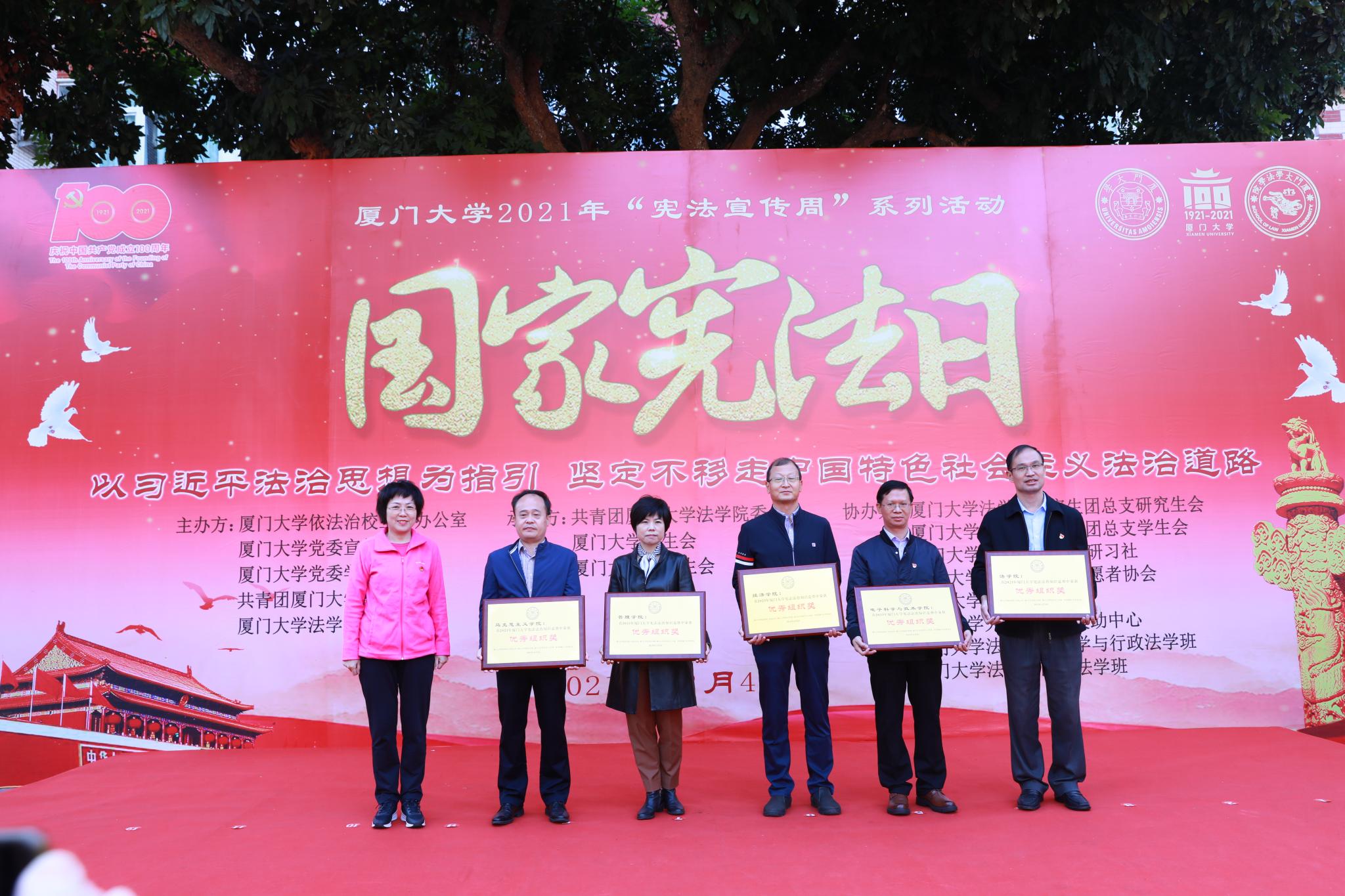 校党委常委、副校长邓朝晖,校党委常委、组织部部长、统战部部长孙理,厦门市保密局,学校办公室、法治办、纪委办、监察处、组织部、宣传部、学生处、保卫处等相关负责人出席活动。学校为法学院、电子科学与技术学院、经济学院、管理学院、人文学院、马克思主义学院颁发“学宪法 讲宪法”法治宣传教育系列活动优秀组织奖,为获奖同学颁发获奖证书。法学院领导班子、师生代表参加活动。