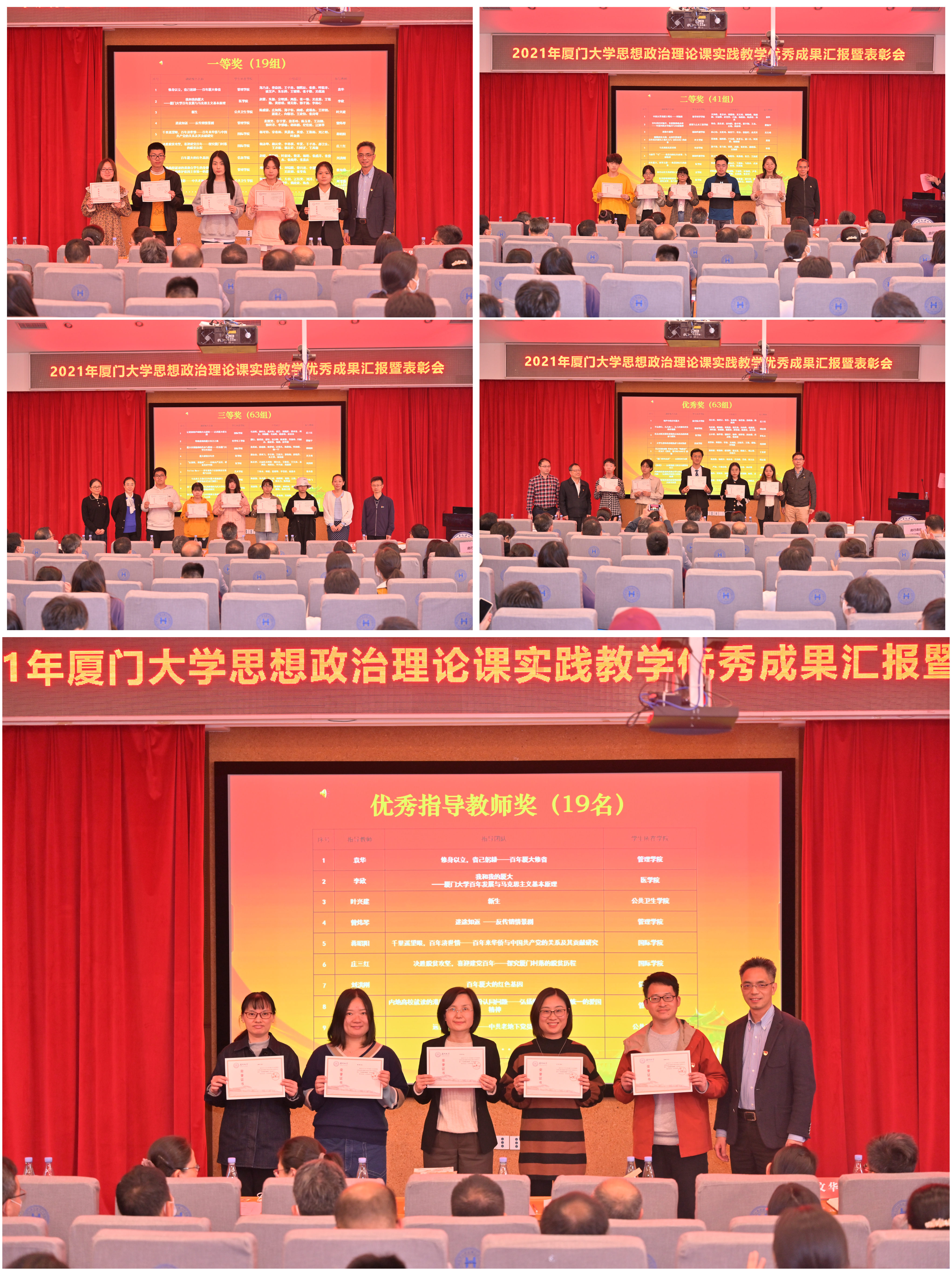 教务处副处长、现代教育技术中心副主任黄艳萍宣读《关于表彰2021年厦门大学思想政治理论课实践教学优秀成果、优秀指导教师的决定》。本次共有186组成果报告获奖,其中一等奖19组,二等奖41组,三等奖63组以及优秀奖63组,袁华等19位老师获得“优秀指导教师”荣誉称号。周大旺及其他与会领导为师生颁发了获奖证书。