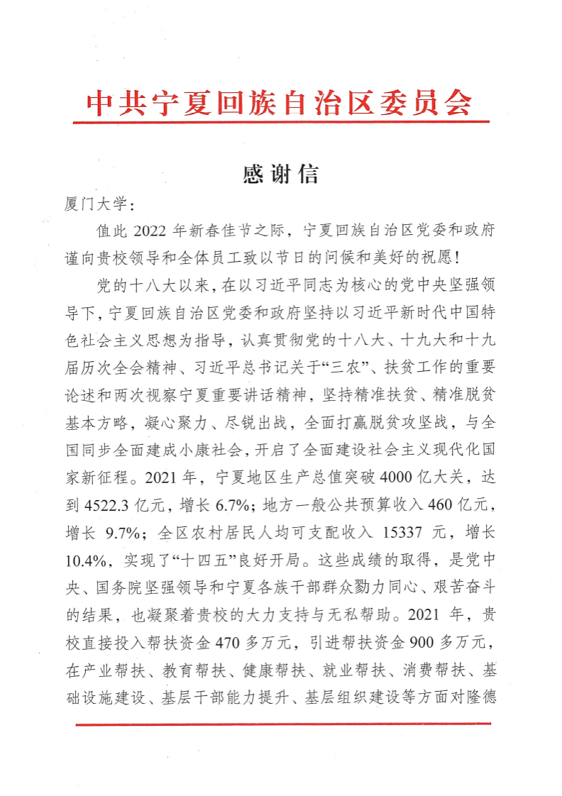 近日,宁夏回族自治区党委和政府给我校发来感谢信,对我校在定点帮扶工作中展现的责任担当和倾力融入闽宁协作大局、全面推进隆德县乡村振兴作出的积极贡献表示衷心的感谢。