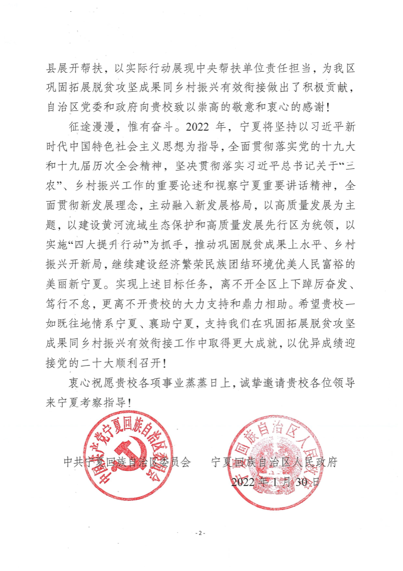 信中写道:“2021年,贵校直接投入帮扶资金470多万元,引进帮扶资金900多万元,在产业帮扶、教育帮扶、健康帮扶、就业帮扶、消费帮扶、基础设施建设、基层干部能力提升、基层组织建设等方面对隆德县展开帮扶,以实际行动展现中央帮扶单位责任担当,为我区巩固拓展脱贫攻坚成果同乡村振兴有效衔接做出了积极贡献,自治区党委和政府向贵校致以崇高的敬意和衷心的感谢!”