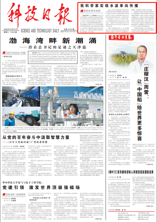 5月24日,《科技日报》头版刊发题为《我科学家实现水波单向传播》的文章,报道我校陈焕阳教授课题组借鉴人工表面等离激元的理论方法,在水波局域现象研究取得重要突破,提出水波极化激元新概念,并通过设计的超材料结构实现水波的单向传播。