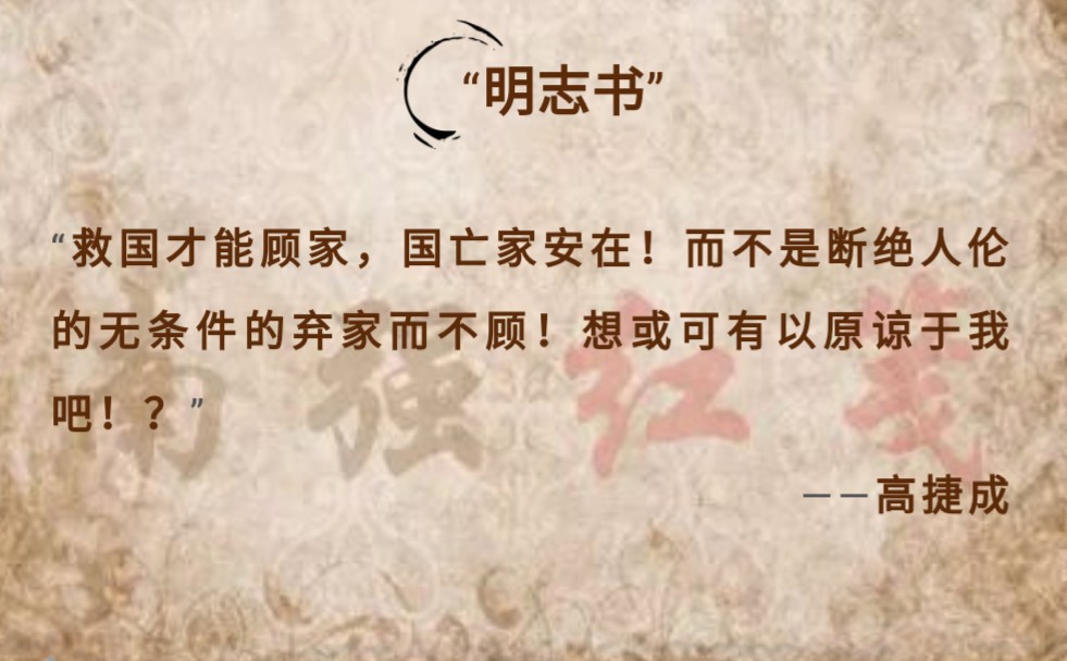 当红军历尽艰辛抵达陕北后,高捷成在陕北的窑洞里写了一封信,托叔父转交给父母。“在这六年中东西奔波,南北追逐,历尽一切千辛万苦,雪山草地,万里长征,在所不辞!无非为的是挽救国家的危亡!”这时已是1937年4月,自高捷成离开父母与妻儿,弃商从戎已是6年之久。