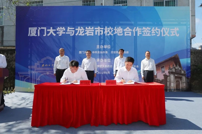 厦门大学党委常委、副校长江云宝和龙岩市委常委、副市长王洋签署《关于支持龙岩建设高水平产业研究院合作备忘录》。江云宝和新罗区政府主要负责同志签署《校地合作协议》。