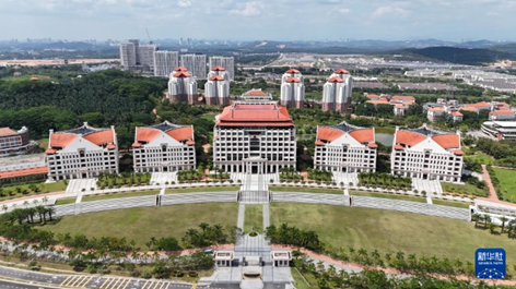 这张资料照片显示的是马来西亚雪兰莪州的厦门大学马来西亚分校教学楼全貌(无人机拍摄)。新华社发(厦门大学马来西亚分校供图)