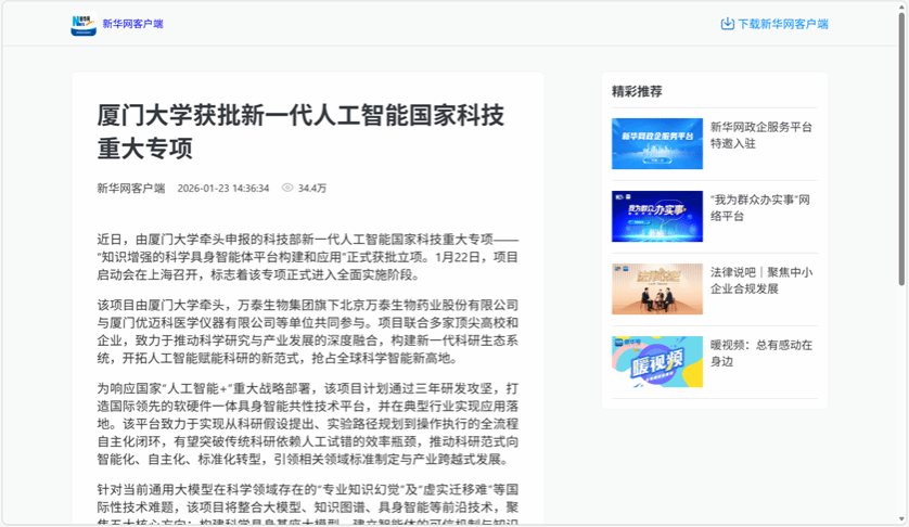 近日,由厦门大学牵头申报的科技部新一代人工智能国家科技重大专项——“知识增强的科学具身智能体平台构建和应用”正式获批立项。1月22日,项目启动会在上海召开,标志着该专项正式进入全面实施阶段。