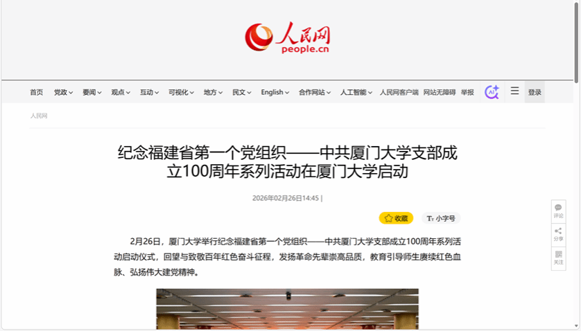 2月26日,厦门大学举行纪念福建省第一个党组织——中共厦门大学支部成立100周年系列活动启动仪式,回望与致敬百年红色奋斗征程,发扬革命先辈崇高品质,教育引导师生赓续红色血脉、弘扬伟大建党精神。