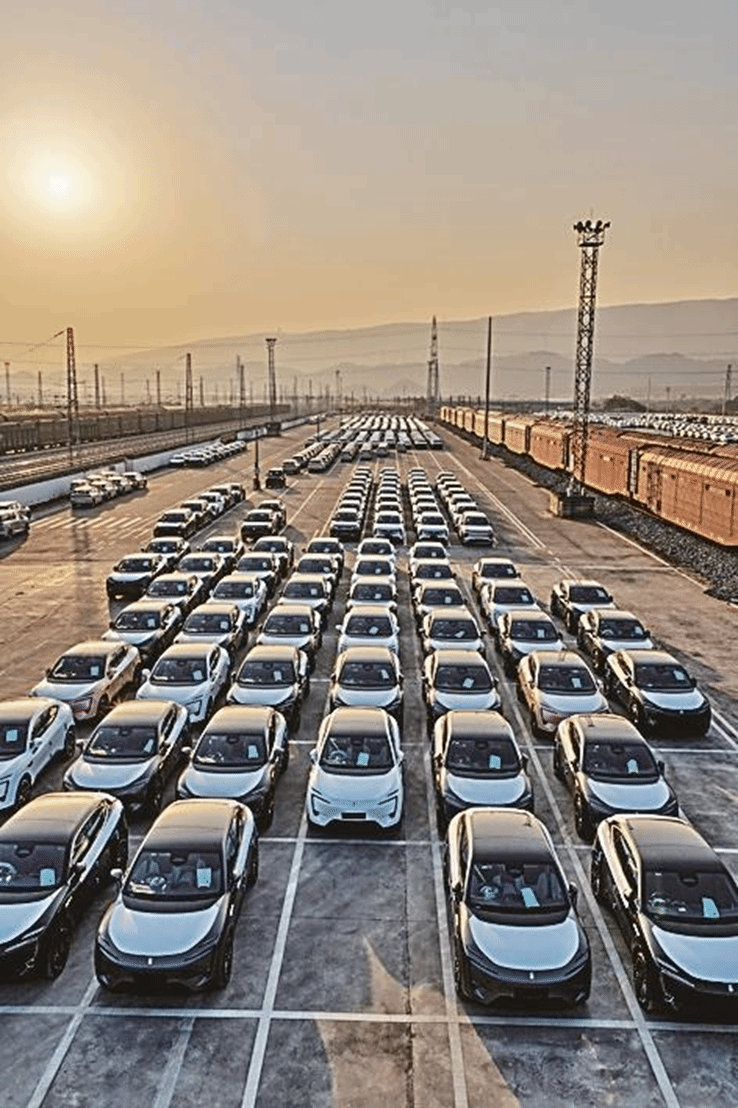 2025年11月29日,重庆果园港内,新能源汽车等待出海。新华社发