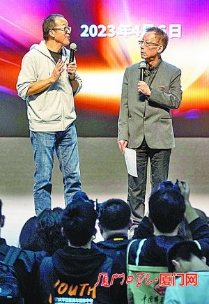 ▲俞敏洪应邀在厦门大学人文与艺术高等研究院举办的“海岳学术云”讲座中发表演讲,易中天担任讲座主持人。(本报记者 林铭鸿 摄)