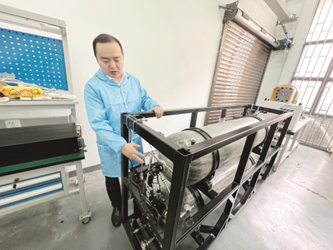 随着关键技术突破,产业化成为新的焦点。实验室里,为槽罐车研发的车载供氢系统控制器上,集成的传感器能检测到低至百万分之五十级别的氢气浓度,为氢能安全装上了“智能锁”。从天空到地面再到江河湖海,王亚雄团队的氢能技术探索正延伸至多个交通领域。