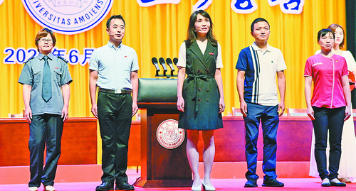 厦门大学后勤集团安防员阿姨(左一)、食堂阿姨(前排右一)被请上厦大毕业典礼主席台,祝福同学们前程似锦,并接受全体毕业生的深情鞠躬。(厦门大学党委宣传部 供图)