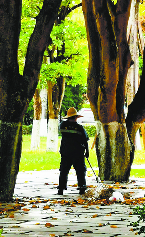 美丽的厦大校园离不开厦大后勤人员的辛勤付出,图为后勤人员冒着酷暑打扫校园。