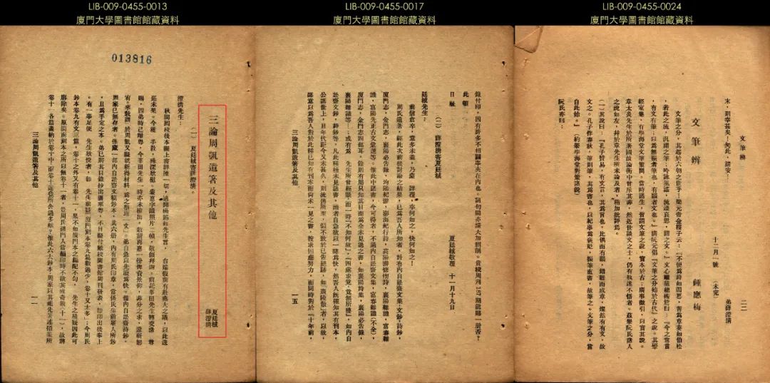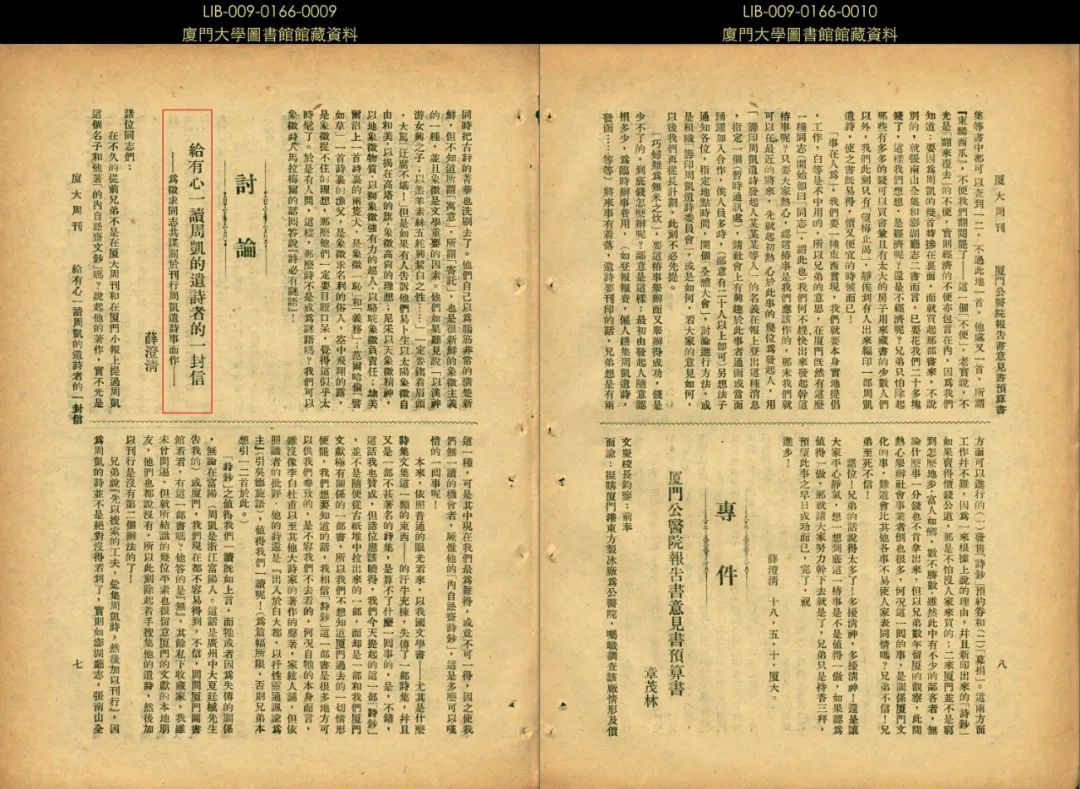 ▲夏廷棫、薛澄清《关于“周凯遗著”的通讯》,《厦大周刊》1928年第187、188期