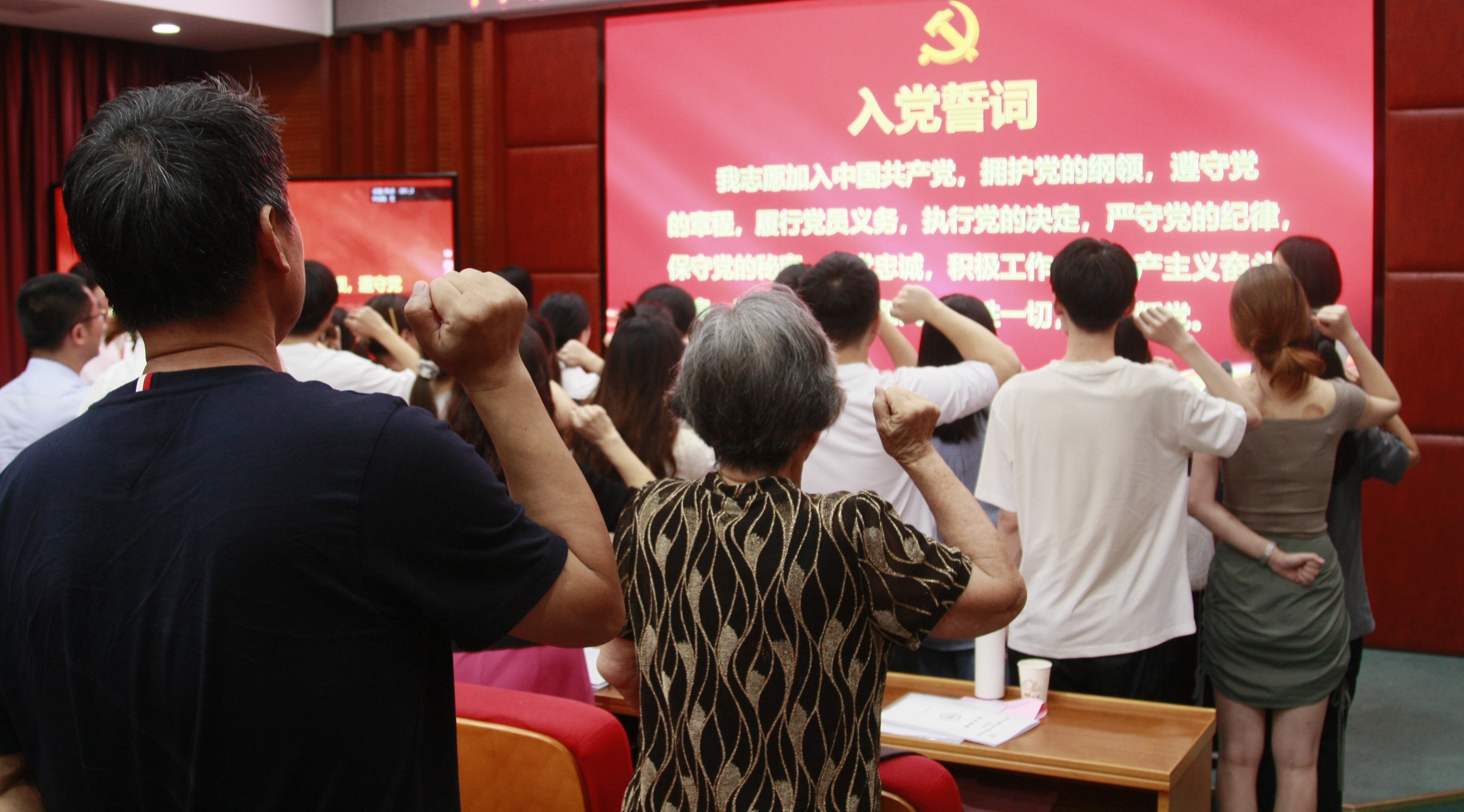 红旗昭昭,初心不忘。在中国语言文学系党委副书记葛学凤的带领下,全体党员高举右拳,新发展党员进行入党宣誓、老党员重温入党誓词。铿锵有力的宣誓声饱含着与会党员对党的无限忠诚以及永葆党员先进性、为共产主义事业奋斗终身的坚定信念。