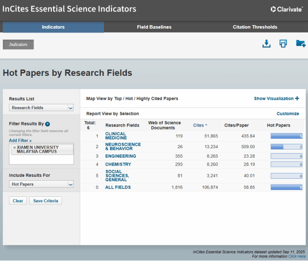 根据科睿唯安在2025年11月发布的数据显示,厦门大学马来西亚分校化学学科首次进入ESI全球排名前1%,标志着分校在该领域迈入了国际高水平学科行列。迄今为止,厦大马校共有临床医学、神经科学与行为科学、工程学、普通社会科学、化学5个学科跻身ESI全球排名前1%。目前,厦大马校共上榜ESI高水平论文106篇,热点论文8篇。其中,高水平论文指根据领域和发表年份,排名进入前1%的论文;热点论文指在近两个月中,引用排名在前0.1%的...