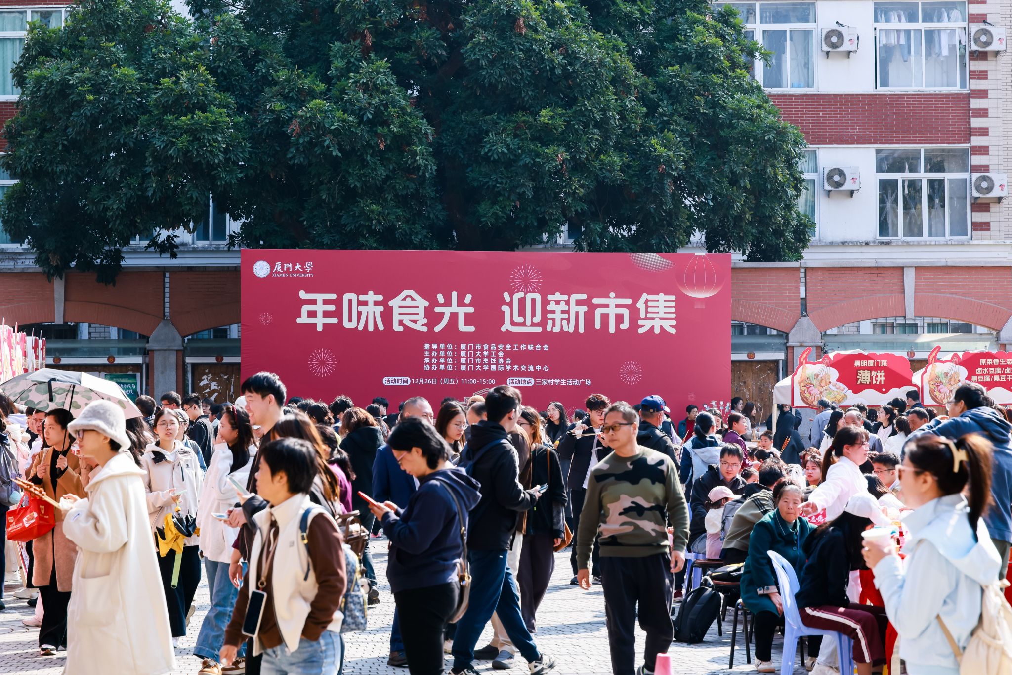 12月26日,由厦门大学工会主办、厦门市烹饪协会承办、厦门大学国际学术交流中心协办的“年味食光美食市集”在三家村广场举办,为全校师生奉上了一场集美食、文化、购物于一体的年终盛宴,打造了一场名副其实的“家门口的年货美食节”。本次活动集结了50余家厦门知名餐饮食品品牌与非遗手作单位,将地道的闽南年味零距离呈现在师生面前。现场设置的“鹭品”认证年货专区,产品丰富、品质有保障,成为师生们置办年货的首选,让大...
