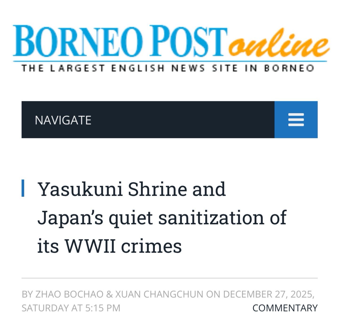 12月26至27日,厦门大学新闻传播学院副院长宣长春副教授和新华社研究院智库研究员赵博超合作,接连在马来西亚《婆罗洲邮报》和韩国《亚洲经济》两大国际媒体发表题为《靖国神社和日本正在对二战罪行悄悄“洗白”》(YasukuniShrineandJapan’squietsanitizationofitsWWIIcrimes)的英文评论文章。据悉,《婆罗洲邮报》是马来西亚最具影响力的英文主流媒体之一,《亚洲经济》也是韩国主流财经媒体之一。文章以详实史料与敏锐的政...