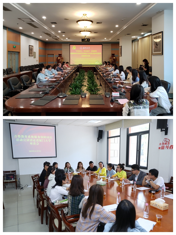 校党委书记张彦会见了宣讲团一行。他指出,宣讲团从首都北京跨越千里来到祖国东南,与厦大师生分享参与阅兵、群众游行、联欢活动的经历和感悟,带领厦大师生重温那场震撼人心的国之大典,重现那汹涌澎湃的爱国激情,为厦大开展爱国主义教育送上了精彩一课。他表示,厦门大学有着光荣的历史和传统,始终与国家同呼吸共命运,在全校上下深入开展“不忘初心,牢记使命”主题教育期间,此次宣讲为广大师生带来青年人和首都大学生青春的律动和火热的情感,勉励大家把小我融入大我、把青春献给祖国,做新时代的奋斗者、追梦人。
