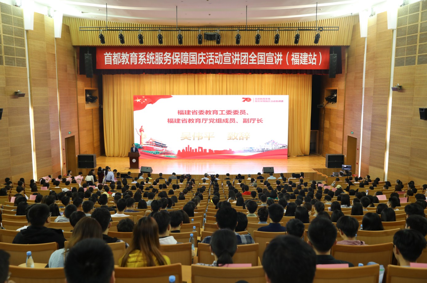11月7日上午,科艺中心报告厅座无虚席,不时掌声阵阵。由北京工业大学、中国人民公安大学优秀师生代表组成的首都教育系统服务保障国庆活动宣讲团来到我校,讲述他们参与国庆活动的亲身经历和深刻感悟。厦门大学、集美大学、厦门理工学院的千名师生代表齐聚一堂,聆听了报告。福建省教育厅党组成员、副厅长吴伟平主持。