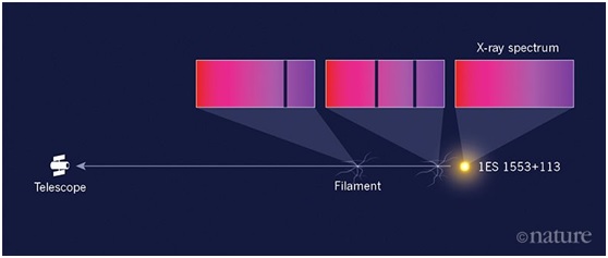 图二 来自意大利国立天文研究所和美国哈佛-史密斯天体物理中心的Nicastro等人的最新发现。他们利用XMM-牛顿X射线望远镜观测名为1ES 1553+113的极亮蝎虎天体,并在累加的光谱中找到红移分别为0.43(距离我们约78亿光年)和0.36(距离约63亿光年)氧离子的吸收线系统,从而认为找到了部分失踪重子的去向。