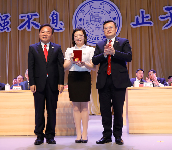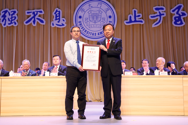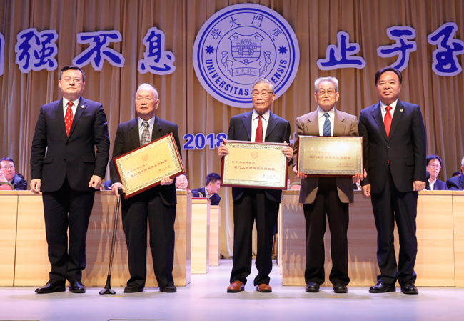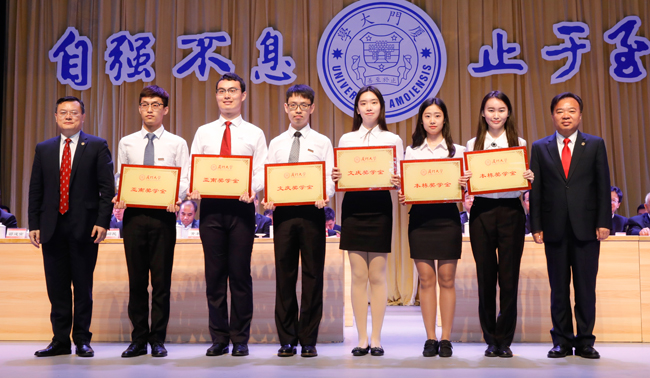 大会还举行了奖教金、通令嘉奖、奖学金颁奖仪式。副校长邬大光宣读了表彰决定。周绍民、吴伯僖、胡培兆教授获“南强杰出贡献奖”,“溯源”团队和“玻尔科技”团队(获第三届中国“互联网+”大学生创新创业大赛金奖),金砖国家领导人厦门会晤小白鹭厦门大学志愿者团队、金砖国家领导人厦门会晤厦门大学演出团队,“FY”团队(获2017-2018年度“垃圾投进趣·全国青年公益实践大赛”全国总冠军,获第十届全国大学生节能减排社会实践与科技竞赛三等奖,2017全国高校学生公寓工作创新成果奖一等奖),“保贝e+”团队(获第三届中国青年志愿服务公益创业大赛金奖、第三届中国青年志愿服务项目大赛金奖),外文学院2016级硕士研究生高昕获学校“通令嘉奖”,高昕获“嘉庚奖章”,336位老师、1142位学生分别荣获2018年度厦门大学校庆期间各项校级奖教金、奖学金。校领导和嘉宾为获奖者颁奖。