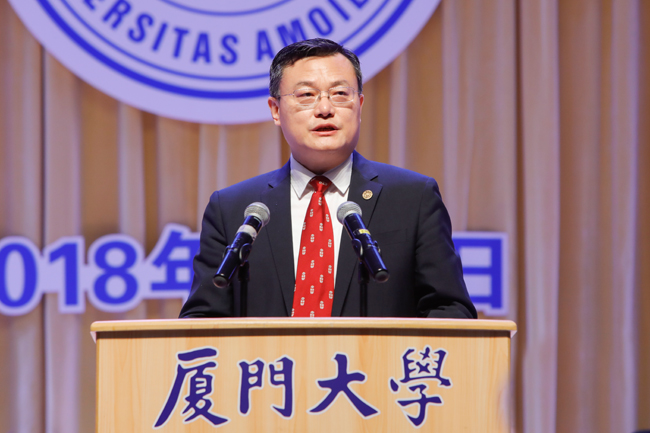 新时代东风浩荡,中国梦曙光在前,厦门大学的明天必将更加美好。再过三年,我们也将迎来百年校庆。更重要的是,厦门大学第一个百年目标将通过我们的努力在我们手中而实现。幸福都是奋斗出来的,只有奋斗的人生才称得上幸福的人生,新时代是奋斗者的时代。站在新时代新起点,让我们以习近平新时代中国特色社会主义思想为指引,紧密团结在以习近平同志为核心的党中央周围,增强“四个意识”,坚定“四个自信”,落实“四个服务”,团结一致、奋发有为,感恩前行、锐意进取,以奋斗成就“双一流”建设目标,用实干托起“两个百年”奋斗梦想,在争创一流的伟大征程中写好属于厦大人的“奋进之笔”和“得意之作”!